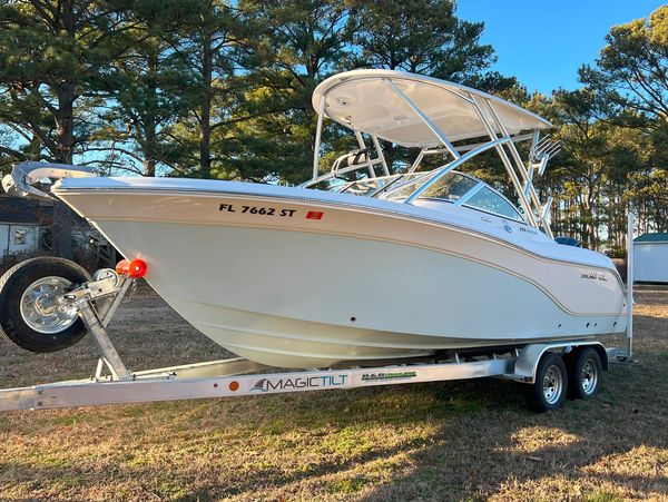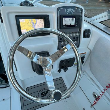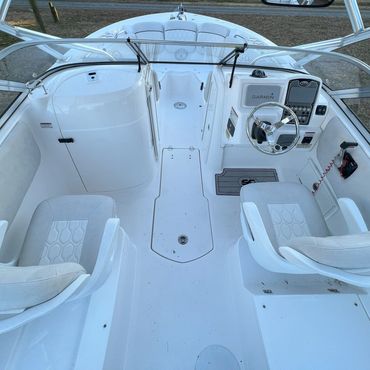 Welcome to fun on the water with this great dual console for the family. Layout includes a spacious and comfortable bow seating area that has a filler cushions to make the whole area a sun lounger when inserted. Two captains chairs. Full cushions across aft seating area. Fully enclosed head. Ski tow bar. Fresh water wash down. Boarding ladder to make getting in the boat easy and safe. Aft stern eyes to allow area for securing a Lilly pad for sandbar fun.
